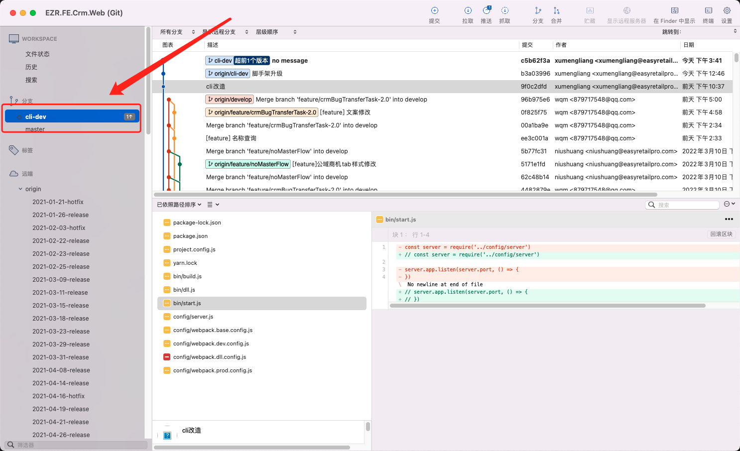 cli-dev分支是脚手架改造后的分支,你可以把此分支合并到你现有的开发分支,或者你可以切换到此分支,把我上面讲到的两个改动配置文件拷贝到你项目的对应文件中去。